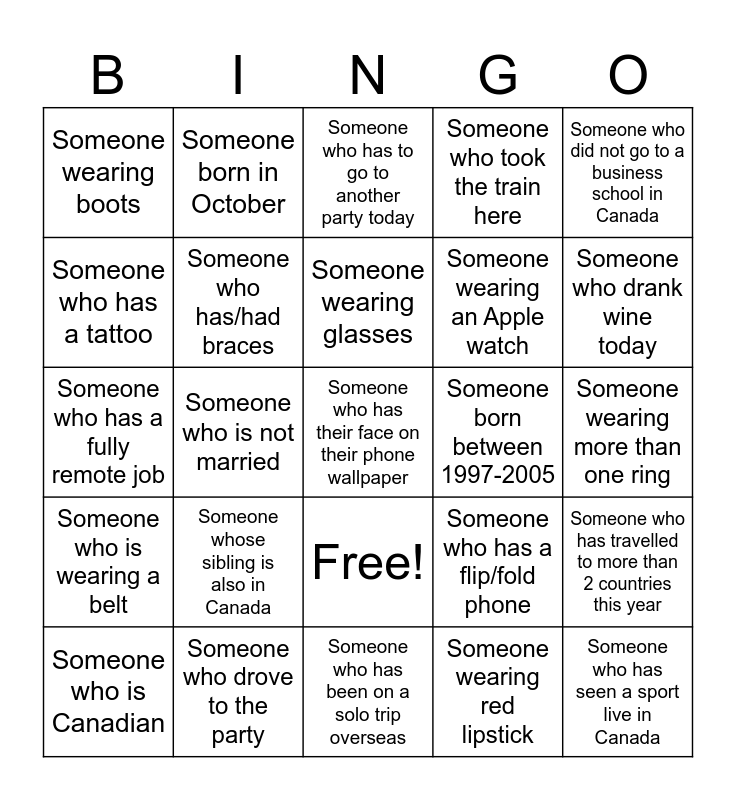This bingo card has 26 words: Free!, Someone wearing red lipstick, Someone wearing glasses, Someone who drove to the party, Someone who did not go to a business school in Canada, Someone wearing boots, Someone who has a tattoo, Someone born in October, Someone wearing more than one ring, Someone who has a flip/fold phone, Someone wearing an Apple watch, Someone who has a fully remote job, Someone who has travelled to more than 2 countries this year, Someone who is Canadian, Someone who is not married, Someone whose parents live in Canada, Someone who took the train here, Someone who is wearing a belt, Someone who has to go to another party today, Someone who has their face on their phone wallpaper, Someone who drank wine today, Someone who has been on a solo trip overseas, Someone born between 1997-2005, Someone whose sibling is also in Canada, Someone who has/had braces and Someone who has seen a sport live in Canada.