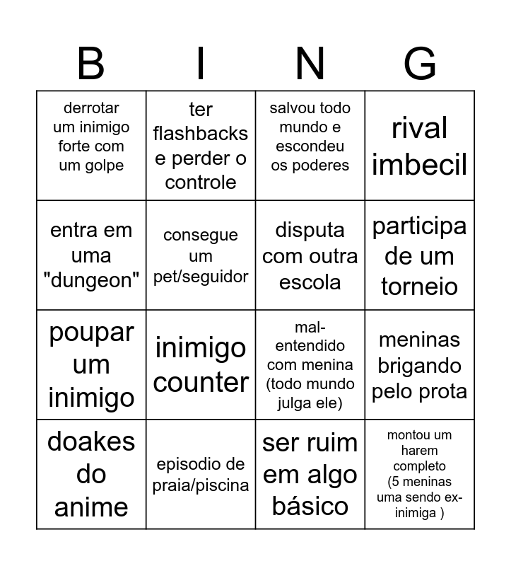 This bingo card has 16 words: episodio de praia/piscina, meninas brigando pelo prota, salvou todo mundo e escondeu os poderes, derrotar um inimigo forte com um golpe, poupar um inimigo, ter flashbacks e perder o controle, mal-entendido com menina (todo mundo julga ele), ser ruim em algo básico, entra em uma "dungeon", consegue um pet/seguidor, doakes do anime, rival imbecil, inimigo counter, participa de um torneio, disputa com outra escola and montou um harem completo (5 meninas uma sendo ex-inimiga ).