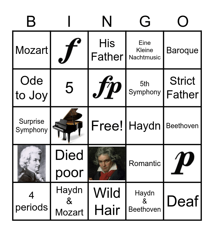 This bingo card has 8 images, a free space and 21 words: 4 periods, Classical, Mozart, His Father, 5, Died poor, Haydn, Haydn & Mozart, Beethoven, Deaf, Wild Hair, Haydn & Beethoven, Strict Father, Baroque, Surprise Symphony, Romantic, Modern, 5th Symphony, Ode to Joy, Eine Kleine Nachtmusic and 300 years ago.