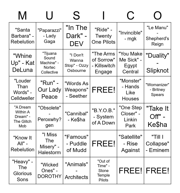 This bingo card has 36 words: FREE!, "Famous" - Puddle of Mudd, "Out of Time" - Stone Temple Pilots, "Whine Up" - Kat DeLuna, "A Dream Within A Dream" - The Glitch Mob, FREE!, "Tijuana Sound Machine" - Nortec Collective, "Animals" - Architects, "Invincible" - mgk, "Satellite" - Rise Against, "Duality" - Slipknot, "Ride" - Twenty One Pilots, "Till I Collapse" - Eminem, "Run" - Our Lady Peace, "The Arms of Sorrow" - Killswitch Engage, "Santa Barbara" - Rebelution, "Know It All" - Rebelution, "Monster" - Hands Like Houses, "Louder Than Words" - Celldweller, "In The Dark" - DEV, "Words As Weapons" - Seether, "Obsolete" - Peroxwhy?gen, "B.Y.O.B." - System of A Down, "Cannibal" - Ke$ha, "One Step Closer" - Linkin Park, "Paparazzi" - Lady Gaga, "You Make Me Sick" - Egypt Central, "Wicked Ones" - DOROTHY, "I Don't Wanna Stop" - Ozzy Osbourne, "Le Manu" - Shepherd's Reign, FREE!, "Heavy" - The Glorious Sons, "Take It Off" - Ke$ha, "Womanizer" - Britney Spears, "I Miss The Misery" - Halestorm and FREE!.