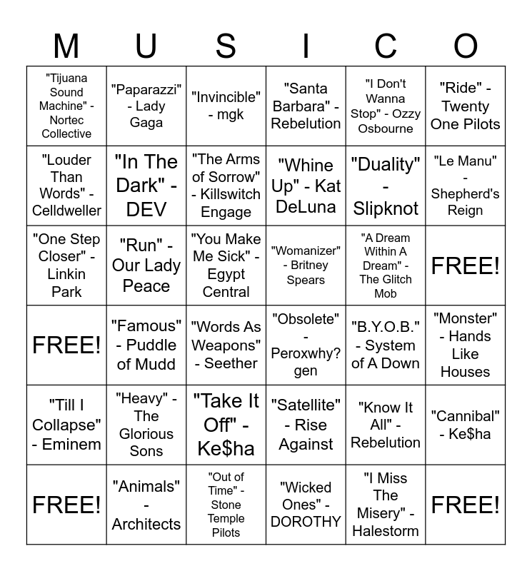 This bingo card has 36 words: FREE!, "Famous" - Puddle of Mudd, "Out of Time" - Stone Temple Pilots, "Whine Up" - Kat DeLuna, "A Dream Within A Dream" - The Glitch Mob, FREE!, "Tijuana Sound Machine" - Nortec Collective, "Animals" - Architects, "Invincible" - mgk, "Satellite" - Rise Against, "Duality" - Slipknot, "Ride" - Twenty One Pilots, "Till I Collapse" - Eminem, "Run" - Our Lady Peace, "The Arms of Sorrow" - Killswitch Engage, "Santa Barbara" - Rebelution, "Know It All" - Rebelution, "Monster" - Hands Like Houses, "Louder Than Words" - Celldweller, "In The Dark" - DEV, "Words As Weapons" - Seether, "Obsolete" - Peroxwhy?gen, "B.Y.O.B." - System of A Down, "Cannibal" - Ke$ha, "One Step Closer" - Linkin Park, "Paparazzi" - Lady Gaga, "You Make Me Sick" - Egypt Central, "Wicked Ones" - DOROTHY, "I Don't Wanna Stop" - Ozzy Osbourne, "Le Manu" - Shepherd's Reign, FREE!, "Heavy" - The Glorious Sons, "Take It Off" - Ke$ha, "Womanizer" - Britney Spears, "I Miss The Misery" - Halestorm and FREE!.