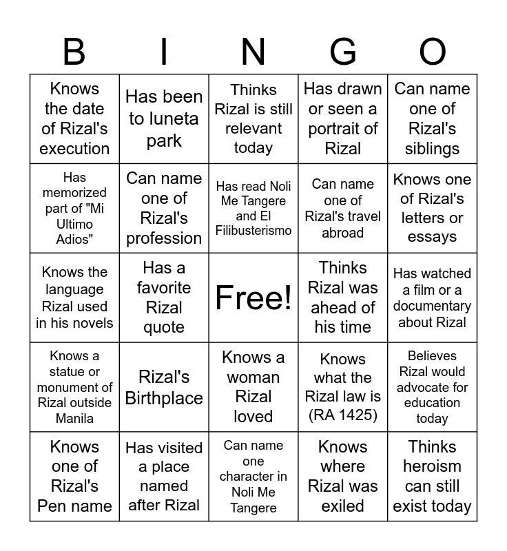 This bingo card has a free space and 24 words: Rizal's Birthplace, Has visited a place named after Rizal, Has read Noli Me Tangere and El Filibusterismo, Knows one of Rizal's Pen name, Can name one of Rizal's siblings, Knows the date of Rizal's execution, Has memorized part of "Mi Ultimo Adios", Has been to luneta park, Thinks Rizal was ahead of his time, Knows a woman Rizal loved, Can name one of Rizal's travel abroad, Knows the language Rizal used in his novels, Knows what the Rizal law is (RA 1425), Believes Rizal would advocate for education today, Can name one of Rizal's profession, Knows where Rizal was exiled, Has watched a film or a documentary about Rizal, Thinks Rizal is still relevant today, Knows one of Rizal's letters or essays, Has a favorite Rizal quote, Thinks heroism can still exist today, Knows a statue or monument of Rizal outside Manila, Has drawn or seen a portrait of Rizal and Can name one character in Noli Me Tangere.