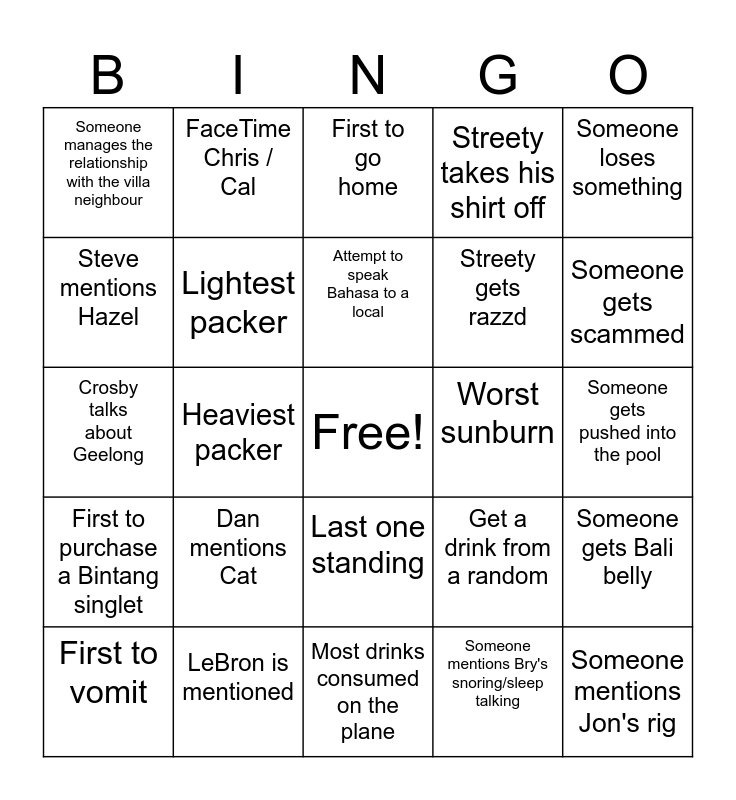 This bingo card has a free space and 24 words: Dan mentions Cat, LeBron is mentioned, Attempt to speak Bahasa to a local, First to vomit, Someone loses something, Someone manages the relationship with the villa neighbour, Steve mentions Hazel, FaceTime Chris / Cal, Worst sunburn, Last one standing, Streety gets razzd, Crosby talks about Geelong, Get a drink from a random, Someone gets Bali belly, Lightest packer, Someone mentions Bry's snoring/sleep talking, Someone gets pushed into the pool, First to go home, Someone gets scammed, Heaviest packer, Someone mentions Jon's rig, First to purchase a Bintang singlet, Streety takes his shirt off and Most drinks consumed on the plane.
