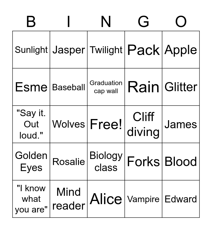 This bingo card has a free space and 52 words: Bella, Edward, Jacob, Alice, Rosalie, Emmett, Jasper, Carlisle, Esme, Charlie, Baseball, Sparkle, Blood, Forks, Meadow, Prom, Graduation cap wall, Cliff diving, Wedding, Apple, Wolves, Vampire, Sunlight, Rain, Onion, Heartbreak, Moonlight, Cold skin, Glitter, Imprint, Red eyes, Pack, New Moon, Eclipse, Breaking Dawn, Twilight, Mind reader, The Cullens, The Volturi, Victoria, Renesmee, James, Golden Eyes, Truck, Biology class, Battle, Loch Ness monster, "Say it. Out loud.", "You're impossibly fast.", "Hold on tight, spider monkey", "I know what you are" and "where have you been, Loca?".