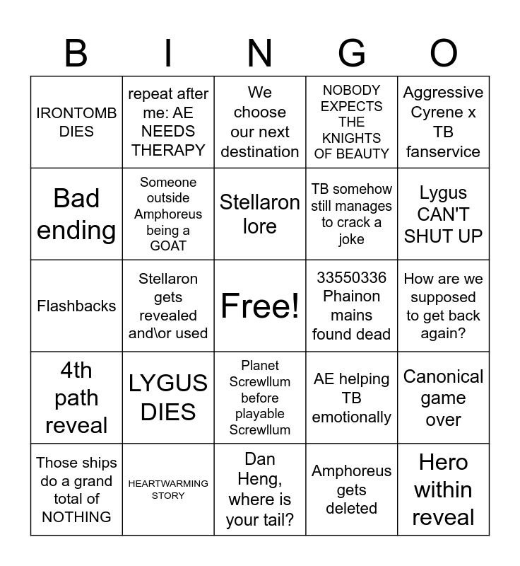 This bingo card has a free space and 24 words: LYGUS DIES, HEARTWARMING STORY, Stellaron lore, Those ships do a grand total of NOTHING, Aggressive Cyrene x TB fanservice, IRONTOMB DIES, Bad ending, repeat after me: AE NEEDS THERAPY, 33550336 Phainon mains found dead, Planet Screwllum before playable Screwllum, TB somehow still manages to crack a joke, Flashbacks, AE helping TB emotionally, Canonical game over, Someone outside Amphoreus being a GOAT, Amphoreus gets deleted, How are we supposed to get back again?, We choose our next destination, Lygus CAN'T SHUT UP, Stellaron gets revealed and\or used, Hero within reveal, 4th path reveal, NOBODY EXPECTS THE KNIGHTS OF BEAUTY and Dan Heng, where is your tail?.