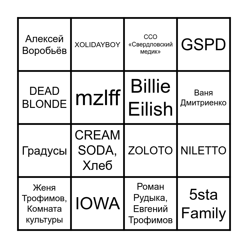 This bingo card has 66 words: The Hatters, Бридж, nowkie, Минаева, Karna.val, Моя Мишель, XOLIDAYBOY, Дима Билан, Ваня Дмитриенко, Баста, Bruno Mars, Maroon 5, Роман Рудыка, Евгений Трофимов, DEAD BLONDE, pyrokinesis, mzlff, NILETTO, Алексей Воробьёв, ССО «Приморец», Градусы, Сергей Лазарев, 5sta Family, GSPD, мартин, BEARWOLF, Антон Токарев, The Weekend, Imagine Dragons, Женя Трофимов, Комната культуры, Charlie Puth, Selena Gomez, BLACKPINK, Ольга Бузова, ССО «Вега», Григорий Лепс, Uma2rman, PIZZA, Сироткин, ZOLOTO, Joost, Lady Gaga, Billie Eilish, Arctic Monkeys, IOWA, Тима Белорусских, Егор Крид, Снимки, CREAM SODA, Хлеб, Ёлка, Клава Кока, Люся Чеботина, GONE.Fludd, Soltwine, Charlie XCX, BTS, ССО «Скиф», ССО «Прогресс», Татьяна Куртукова, Любэ, ССО «Свердловский медик», ССО «Зевс», Оля Шевченко, ОСД «Созвездие», ССО «Монолит», ОСД «Горизонт», Lida, Дмитрий Маликов and ooes.