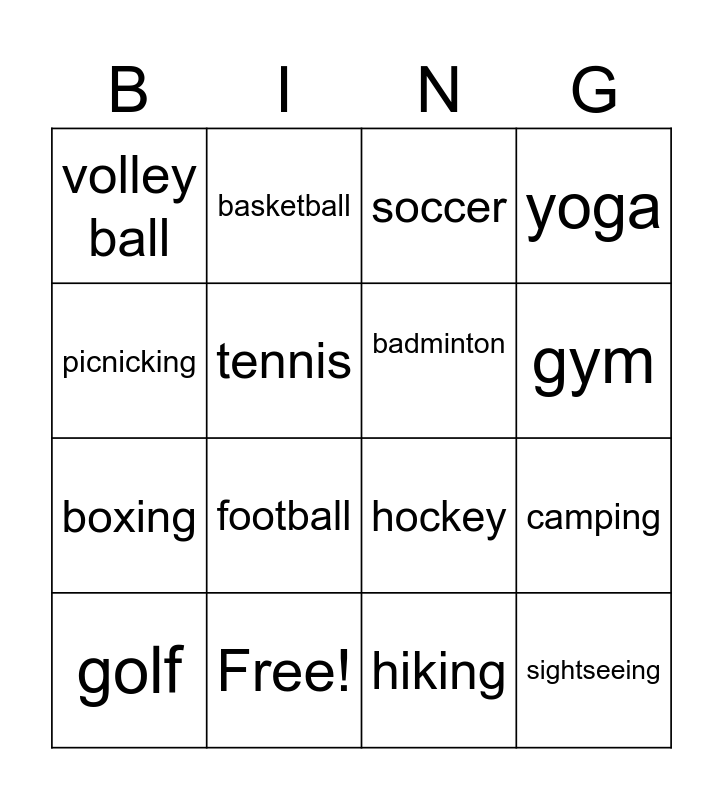 This bingo card has 22 words: Free!, activity, basketball, baseball, tennis, badminton, volley ball, soccer, hockey, sightseeing, boxing, yoga, cycling, jogging, hiking, shopping, camping, golf, football, picnicking, gym and weight training.
