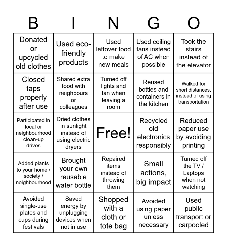 This bingo card has a free space and 25 words: Brought your own reusable water bottle, Shopped with a cloth or tote bag, Turned off lights and fan when leaving a room, Avoided single-use plates and cups during festivals, Took the stairs instead of the elevator, Donated or upcycled old clothes, Closed taps properly after use, Used eco-friendly products, Recycled old electronics responsibly, Repaired items instead of throwing them, Reused bottles and containers in the kitchen, Participated in local or neighbourhood clean-up drives, Small actions, big impact, Turned off the TV / Laptops when not watching, Shared extra food with neighbours or colleagues, Avoided plastic straws and cutlery, Reduced paper use by avoiding printing, Used leftover food to make new meals, Walked for short distances, instead of using transportation, Dried clothes in sunlight instead of using electric dryers, Used public transport or carpooled, Saved energy by unplugging devices when not in use, Added plants to your home / society / neighbourhood, Used ceiling fans instead of AC when possible and Avoided using paper unless necessary.