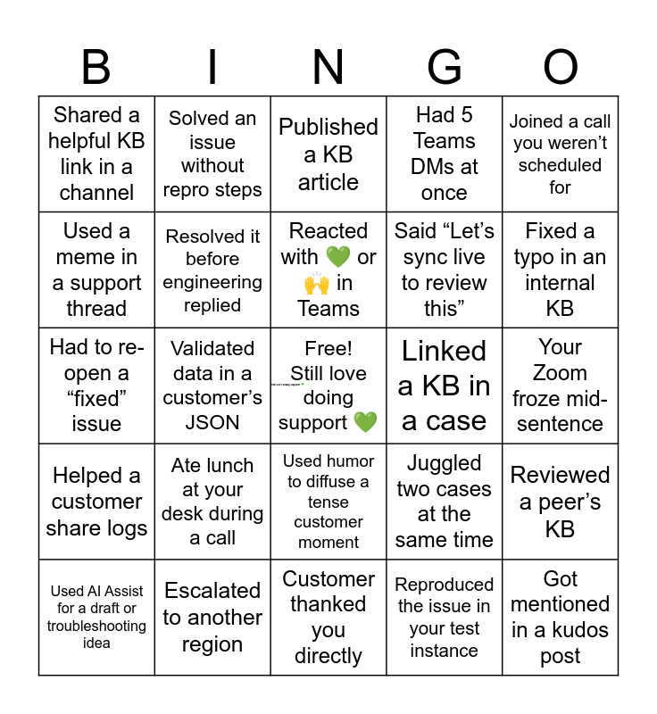 This bingo card has a free space and 60 words: Handled a Sev 1, Escalated to another region, Fixed it on your lunch break, Helped a customer share logs, Reproduced the issue in your test instance, Spotted a duplicate case before anyone else, Resolved it before engineering replied, Stayed on a Zoom longer than 45 minutes, Said “Let’s sync live to review this”, Had a customer who disappeared mid-call, Had 5 Teams DMs at once, Posted a GIF to lighten the mood, Used a meme in a support thread, Helped another TSE debug their case, Tagged the wrong person in Teams, Shared a helpful KB link in a channel, Got mentioned in a kudos post, Joined a call you weren’t scheduled for, Answered a question outside your queue, Reacted with 💚 or 🙌 in Teams, Linked a KB in a case, Published a KB article, Used AI Assist for a draft or troubleshooting idea, Reviewed a peer’s KB, Learned something new from a teammate, Shared a tip or script in chat, Quoted documentation on a customer call, Created a snippet or macro for faster replies, Fixed a typo in an internal KB, Converted an internal KB to public, Used a product log to find the root cause, Caught a small detail that solved everything, Found a workaround before the fix, Filed a defect or enhancement request, Solved an issue without repro steps, Used “clear cache” successfully, Used a custom script to test something, Validated data in a customer’s JSON, Found the answer in an old case comment, Had to re-open a “fixed” issue, Coffee was your first tool of the day, Ate lunch at your desk during a call, Your Zoom froze mid-sentence, Forgot you were unmuted, Juggled two cases at the same time, Said “just one more check” and found the issue, Got pinged right before end of shift, Worked a late-night Sev bridge, Stayed calm through chaos, Used humor to diffuse a tense customer moment, Customer thanked you directly, Customer gave 5-star CSAT, Received kudos from your manager, Helped another region with coverage, Saved a case before escalation, Mentored a new hire, Jumped in on someone else’s case, Turned a negative customer into a fan, Shared good news in your team huddle and Ended the day proud of your work.