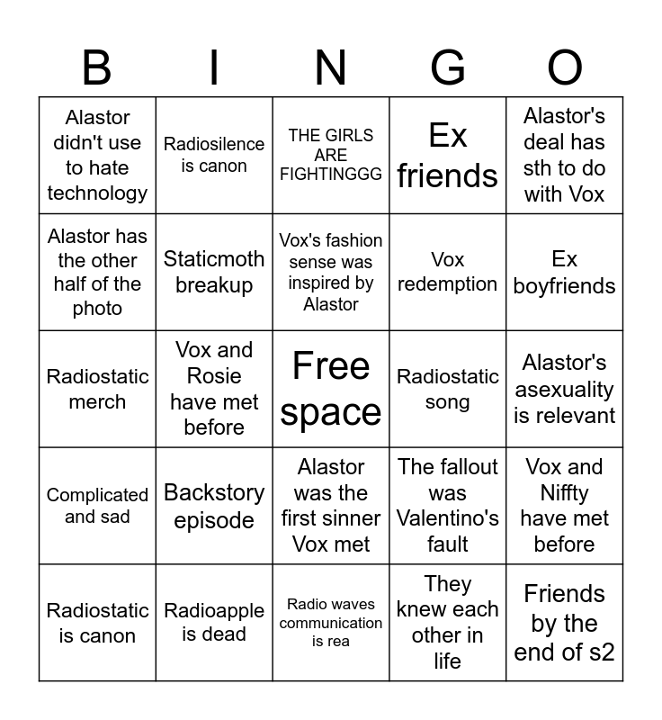 This bingo card has a free space and 24 words: Backstory episode, Radioapple is dead, Vox's fashion sense was inspired by Alastor, Radiostatic is canon, Alastor's deal has sth to do with Vox, Alastor didn't use to hate technology, Alastor has the other half of the photo, Radiosilence is canon, Radiostatic song, Alastor was the first sinner Vox met, Vox redemption, Radiostatic merch, The fallout was Valentino's fault, Vox and Niffty have met before, Staticmoth breakup, They knew each other in life, Alastor's asexuality is relevant, THE GIRLS ARE FIGHTINGGG, Ex boyfriends, Vox and Rosie have met before, Friends by the end of s2, Complicated and sad, Ex friends and Radio waves communication is rea.