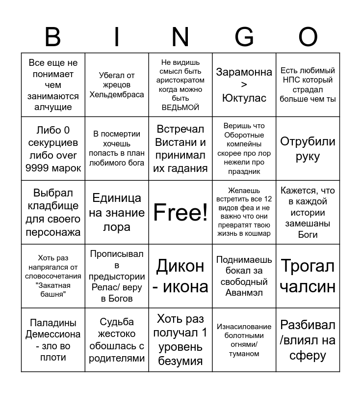 This bingo card has a free space and 24 words: Прописывал в предыстории Релас/ веру в Богов, Судьба жестоко обошлась с родителями, Встречал Вистани и принимал их гадания, Паладины Демессиона - зло во плоти, Есть любимый НПС который страдал больше чем ты, Все еще не понимает чем занимаются алчущие, Либо 0 секурциев либо over 9999 марок, Убегал от жрецов Хельдембраса, Желаешь встретить все 12 видов феа и не важно что они превратят твою жизнь в кошмар, Дикон - икона, Веришь что Оборотные компейны скорее про лор нежели про праздник, Выбрал кладбище для своего персонажа, Поднимаешь бокал за свободный Аванмэл, Трогал чалсин, В посмертии хочешь попасть в план любимого бога, Изнасилование болотными огнями/туманом, Кажется, что в каждой истории замешаны Боги, Не видишь смысл быть аристократом когда можно быть ВЕДЬМОЙ, Отрубили руку, Единица на знание лора, Разбивал /влиял на сферу, Хоть раз напрягался от словосочетания "Закатная башня", Зарамонна > Юктулас and Хоть раз получал 1 уровень безумия.