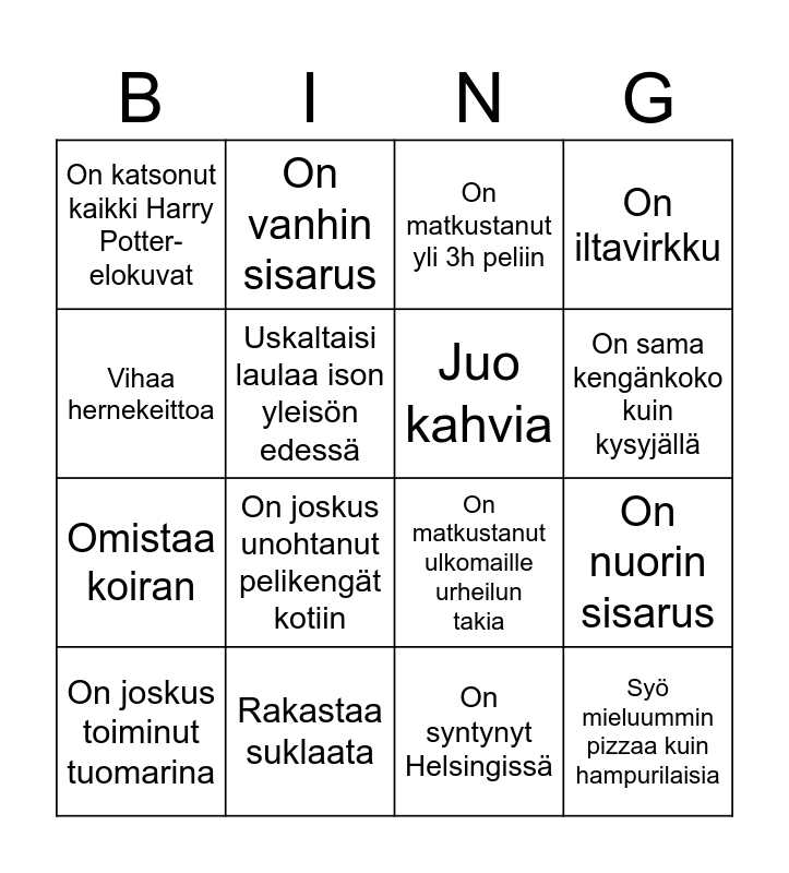 This bingo card has 20 words: On nuorin sisarus, On syntynyt samassa kuussa (kysyjän kanssa), On matkustanut yli 3h peliin, Emma Malm on valmentanut, On joskus toiminut tuomarina, Vihaa hernekeittoa, Rakastaa suklaata, On katsonut kaikki Harry Potter- elokuvat, Omistaa koiran, On vanhin sisarus, On joskus unohtanut pelikengät kotiin, On matkustanut ulkomaille urheilun takia, Uskaltaisi laulaa ison yleisön edessä, Syö mieluummin pizzaa kuin hampurilaisia, Juo kahvia, Osaa sanoa jonkin kielen alkeita (muuta kuin suomi/ englanti), On sama kengänkoko kuin kysyjällä, On iltavirkku, On syntynyt Helsingissä and On syntynyt muualla kuin Helsingissä.