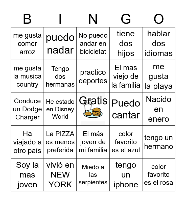 This bingo card has a free space and 24 words: La PIZZA es menos preferida, vivió en NEW YORK, practico deportes, Soy la mas joven, hablar dos idiomas, me gusta comer arroz, me gusta la musica country, puedo nadar, Puedo cantar, El más joven de mi familia, El mas viejo de la familia, Conduce un Dodge Charger, color favorito es el azul, tengo un hermano, Tengo dos hermanas, tengo un iphone, Nacido en enero, No puedo andar en bicicletat, me gusta la playa, He estado en Disney World, color favorito es el rosa, Ha viajado a otro país, tiene dos hijos and Miedo a las serpientes.