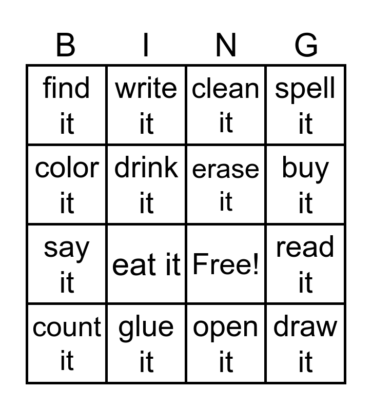 This bingo card has 19 words: Free!, fix it, clean it, draw it, read it, color it, open it, find it, write it, say it, eat it, drink it, erase it, glue it, count it, close it, spell it, buy it and sell it.