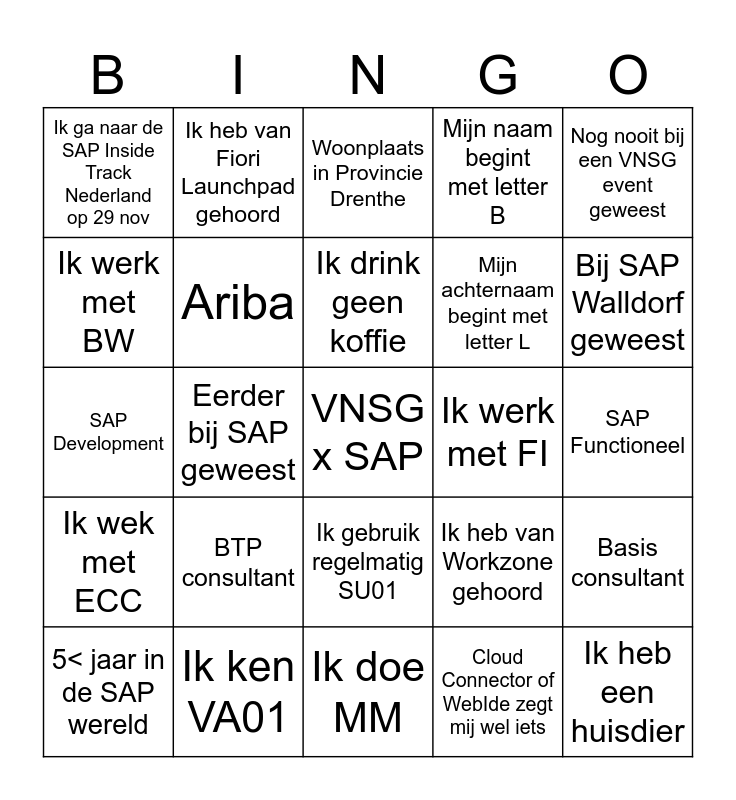 This bingo card has a free space and 24 words: BTP consultant, Ik ken VA01, Ik drink geen koffie, 5< jaar in de SAP wereld, Nog nooit bij een VNSG event geweest, Ik ga naar de SAP Inside Track Nederland op 29 nov, Ik werk met BW, Ik heb van Fiori Launchpad gehoord, Ik werk met FI, Ik gebruik regelmatig SU01, Mijn achternaam begint met letter L, SAP Development, Ik heb van Workzone gehoord, Basis consultant, Ariba, Cloud Connector of WebIde zegt mij wel iets, SAP Functioneel, Woonplaats in Provincie Drenthe, Bij SAP Walldorf geweest, Eerder bij SAP geweest, Ik heb een huisdier, Ik wek met ECC, Mijn naam begint met letter B and Ik doe MM.