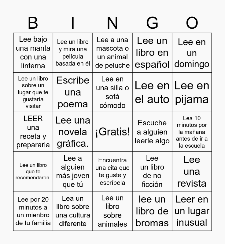 This bingo card has a free space and 24 words: Lee por 20 minutos a un mienbro de tu familia, Lee a alguien más joven que tú, Lee en una silla o sofá cómodo, lee un libro de bromas, Lee en un domingo, Lee bajo una manta con una linterna, Lee un libro y mira una película basada en él, Lee a una mascota o un animal de peluche, Escuche a alguien leerle algo, Lea 10 minutos por la mañana antes de ir a la escuela, LEER una receta y prepararla, Escribe una poema, Lee un libro de no ficción, Lee una revista, Lee un libro sobre un lugar que te gustaría visitar, Lea un libro sobre una cultura diferente, Lee un libro sobre animales, Lee un libro en español, Lee en pijama, Lee un libro que te recomendaron., Lee una novela gráfica., Encuentra una cita que te guste y escríbela, Lee en el auto and Leer en un lugar inusual.
