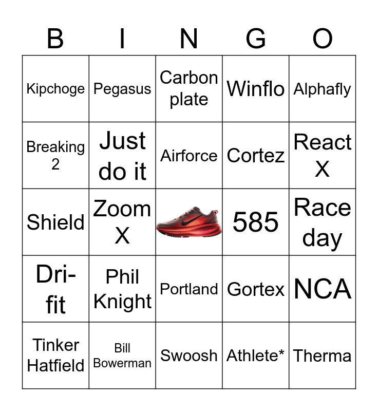 This bingo card has a free space and 24 words: Phil Knight, Bill Bowerman, Airforce, Tinker Hatfield, Alphafly, Kipchoge, Breaking 2, Pegasus, 585, Portland, Cortez, Shield, Gortex, NCA, Just do it, Athlete*, Race day, Carbon plate, React X, Zoom X, Therma, Dri-fit, Winflo and Swoosh.