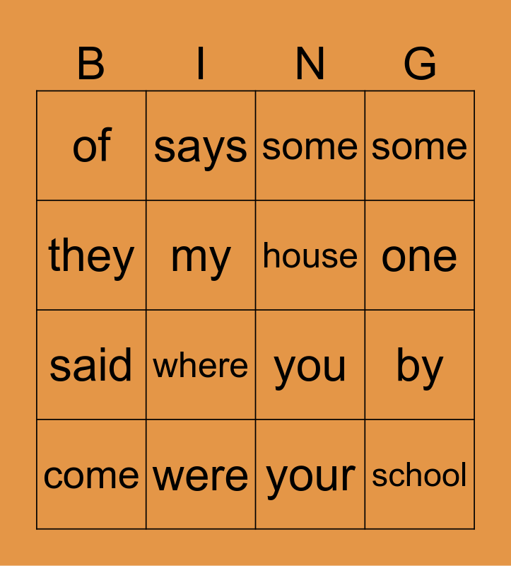 This bingo card has 16 words: were, by, some, of, said, says, you, your, they, my, come, some, where, one, house and school.