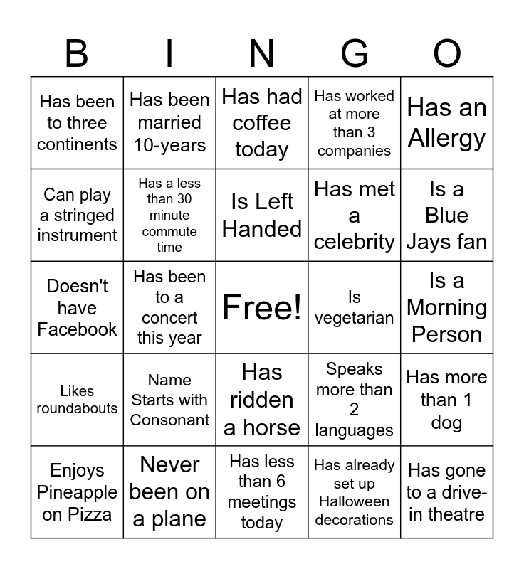 This bingo card has a free space and 24 words: Name Starts with Consonant, Never been on a plane, Is Left Handed, Enjoys Pineapple on Pizza, Has an Allergy, Has been to three continents, Can play a stringed instrument, Has been married 10-years, Is vegetarian, Has ridden a horse, Has met a celebrity, Doesn't have Facebook, Speaks more than 2 languages, Has more than 1 dog, Has a less than 30 minute commute time, Has already set up Halloween decorations, Is a Morning Person, Has had coffee today, Is a Blue Jays fan, Has been to a concert this year, Has gone to a drive-in theatre, Likes roundabouts, Has worked at more than 3 companies and Has less than 6 meetings today.