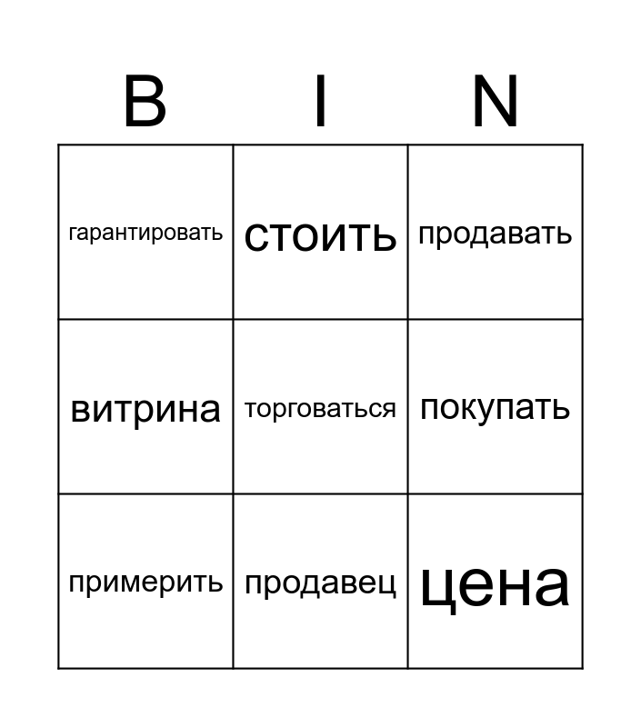 This bingo card has a free space and 8 words: покупать, продавать, стоить, примерить, гарантировать, цена, витрина and продавец.
