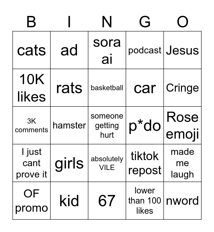 This bingo card has a free space and 24 words: girls, kid, basketball, OF promo, Jesus, cats, 10K likes, ad, p*do, absolutely VILE, car, 3K comments, tiktok repost, made me laugh, rats, lower than 100 likes, Rose emoji, sora ai, Cringe, hamster, nword, I just cant prove it, podcast and 67.