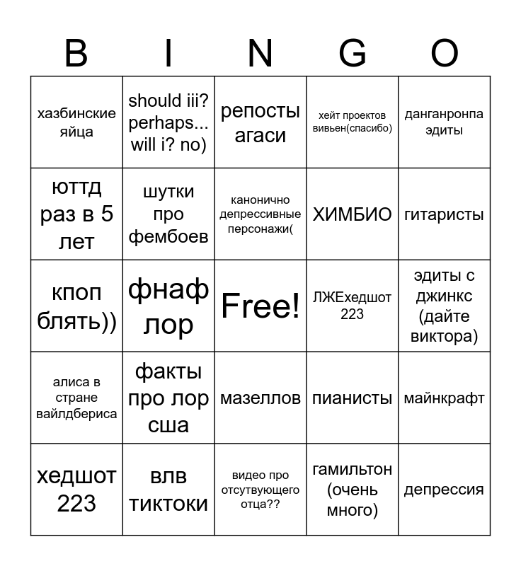 This bingo card has a free space and 24 words: факты про лор сша, влв тиктоки, канонично депрессивные персонажи(, хедшот 223, данганронпа эдиты, хазбинские яйца, юттд раз в 5 лет, should iii? perhaps... will i? no), ЛЖЕхедшот 223, мазеллов, ХИМБИО, кпоп блять)), пианисты, майнкрафт, шутки про фембоев, гамильтон (очень много), эдиты с джинкс (дайте виктора), репосты агаси, гитаристы, фнаф лор, депрессия, алиса в стране вайлдбериса, хейт проектов вивьен(спасибо) and видео про отсутвующего отца??.