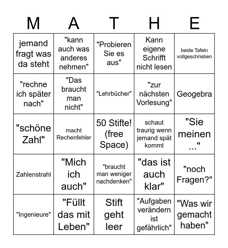 This bingo card has a free space and 24 words: "Mich ich auch", "Füllt das mit Leben", "Lehrbücher", "Ingenieure", beide Tafeln vollgeschrieben, jemand fragt was da steht, "rechne ich später nach", "kann auch was anderes nehmen", schaut traurig wenn jemand spät kommt, "braucht man weniger nachdenken", "zur nächsten Vorlesung", "schöne Zahl", "das ist auch klar", "noch Fragen?", "Das braucht man nicht", "Aufgaben verändern ist gefährlich", "Sie meinen ...", "Probieren Sie es aus", Geogebra, macht Rechenfehler, "Was wir gemacht haben", Zahlenstrahl, Kann eigene Schrifft nicht lesen and Stift geht leer.
