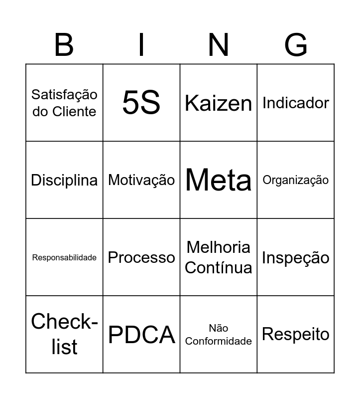 This bingo card has 30 words: SEMANA DA QUALIDADE, Ação Corretiva, Inspeção, Ética, Satisfação do Cliente, Kaizen, Meta, Controle de Qualidade, PDCA, ISO 9001, Não Conformidade, Check-list, Colaboração, Trabalho em Equipe, Processo, Comunicação, Comprometimento, Respeito, Padrão, Disciplina, Melhoria Contínua, Rastreabilidade, 5S, Responsabilidade, Motivação, Indicador, Desperdício, Resultados, Organização and Procedimento.
