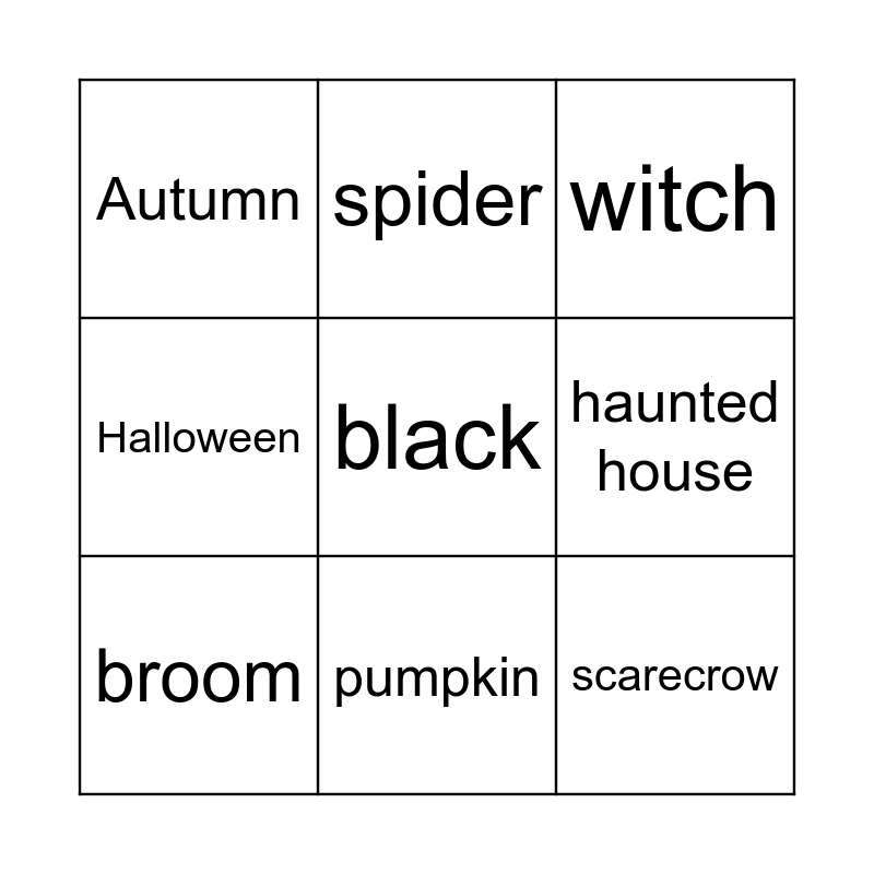 This bingo card has 33 words: cat, mask, ghost, trick-or- treat, BOO!, broom, black, bat, spider, sweets, pumpkin, witch, skeleton, wizard, spell, carve, spooky, costume, Journey..., scary, blood, zombie, Autumn, potion, orange, night, Halloween, scarecrow, haunted house, monster, cobweb, horror and nightmare.