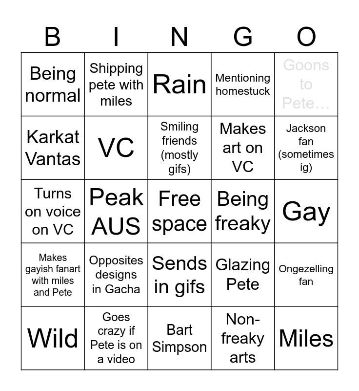 This bingo card has a free space and 24 words: Opposites designs in Gacha, Goes crazy if Pete is on a video, Smiling friends (mostly gifs), Wild, Goons to Pete…, Being normal, Karkat Vantas, Shipping pete with miles, Being freaky, Sends in gifs, Makes art on VC, Turns on voice on VC, Glazing Pete, Ongezelling fan, VC, Non-freaky arts, Gay, Rain, Jackson fan (sometimes ig), Peak AUS, Miles, Makes gayish fanart with miles and Pete, Mentioning homestuck and Bart Simpson.