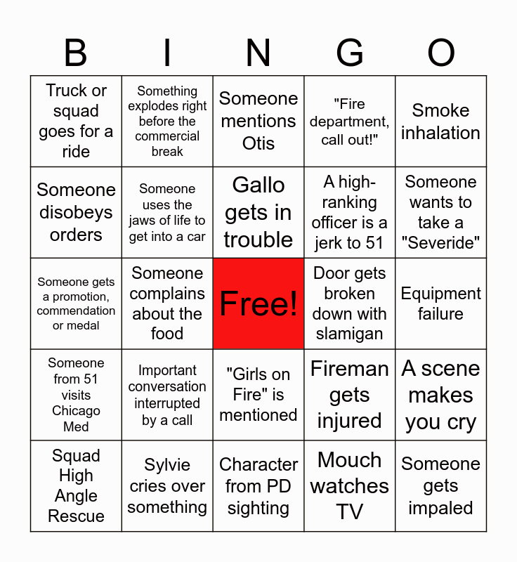 This bingo card has a free space and 48 words: Morning briefing gets interrupted by a call, Someone gets impaled, Character from Med sighting, Character from PD sighting, Important conversation interrupted by a call, Herrmann complains about free drinks, Something explodes right before the commercial break, Boden yells at someone, Someone disobeys orders, Herrmann is annoyed at somebody, Someone uses the jaws of life to get into a car, "Fire department, call out!", A scene makes you cry, Fireman gets injured, Someone dies, Someone drinks alcohol, Gallo gets in trouble, Door gets broken down with slamigan, Firehouse 51 in legal trouble, Smoke inhalation, Someone complains about the food, Mouch watches TV, Truck or squad goes for a ride, A high-ranking officer is a jerk to 51, Someone takes a "Severide", Someone wants to take a "Severide", Squad High Angle Rescue, Someone from 51 is injured at a scene, "Girls on Fire" is mentioned, Someone from 51 visits Chicago Med, Trudy saves and/or assists Mouch, Someone from 51 gets called by their First name, House 51 gets a floater, Severide helps out OFI again, Sylvie cries over something, All 4 vehicles get dispatched for same call (81, 51,3 61), Someone performs a dangerous rescue, Equipment failure, Someone from 51 chases or interrogates a "suspect", Capp does or says something ridiculous, Tony has a speaking part, Joe Cruz is distracted by something, Someone mentions Otis, A scene at Molly's without Herrman, Someone gets a promotion, commendation or medal, Emergency is declared at a scene, Donna makes an apperrance and Squad does a water rescue.
