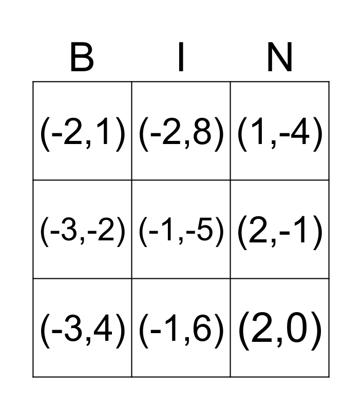 This bingo card has 9 words: (-3,4), (1,-4), (-2,8), (-3,-2), (-2,1), (2,-1), (-1,-5), (2,0) and (-1,6).