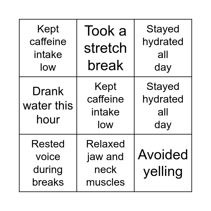 This bingo card has a free space and 8 words: Stayed hydrated all day, Stayed hydrated all day, Took a stretch break, Rested voice during breaks, Kept caffeine intake low, Avoided yelling, Drank water this hour and Relaxed jaw and neck muscles.