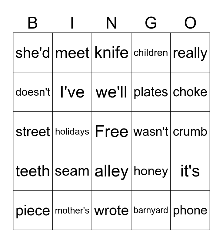 This bingo card has a free space and 24 words: seam, mother's, we'll, piece, really, she'd, doesn't, meet, wasn't, alley, plates, street, honey, it's, I've, barnyard, crumb, knife, choke, holidays, phone, teeth, children and wrote.