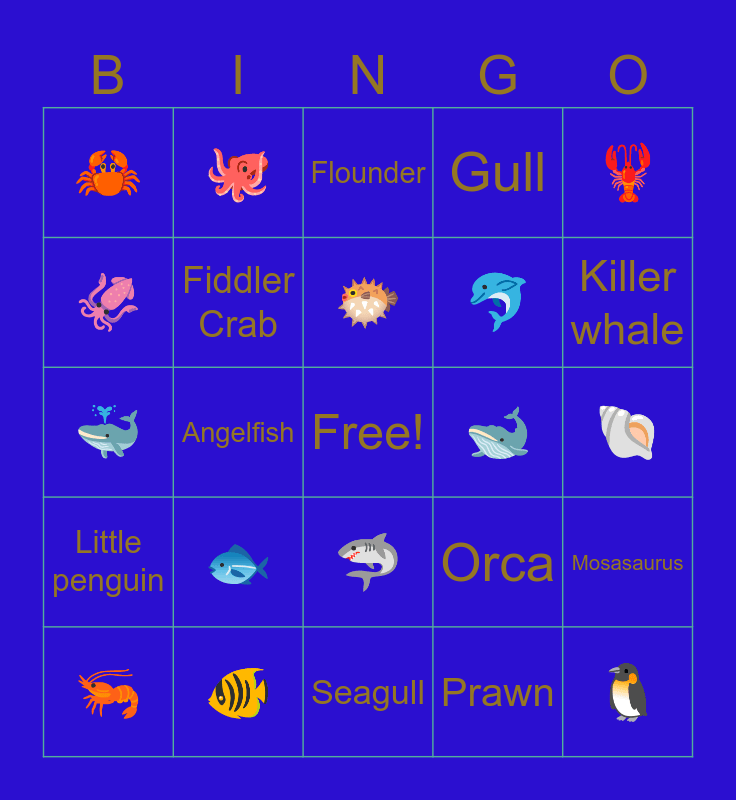 This bingo card has a free space and 24 words: 🐟, 🐠, 🐡, 🦐, 🦞, 🦀, 🦑, 🐙, 🐋, 🦈, 🐬, 🐳, Orca, Mosasaurus, Fiddler Crab, Prawn, 🐚, Flounder, Killer whale, Angelfish, 🐧, Little penguin, Gull and Seagull.