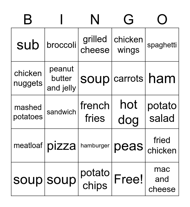 This bingo card has 30 words: soup, salad, sandwich, wrap, sub, grilled cheese, peanut butter and jelly, hamburger, hot dog, potato chips, potato salad, french fries, Free!, mac and cheese, ham, scalloped potatoes, peas, meatloaf, pizza, spaghetti, mashed potatoes, green beans, broccoli, carrots, chicken nuggets, chicken wings, fried chicken, soup, soup and soup.