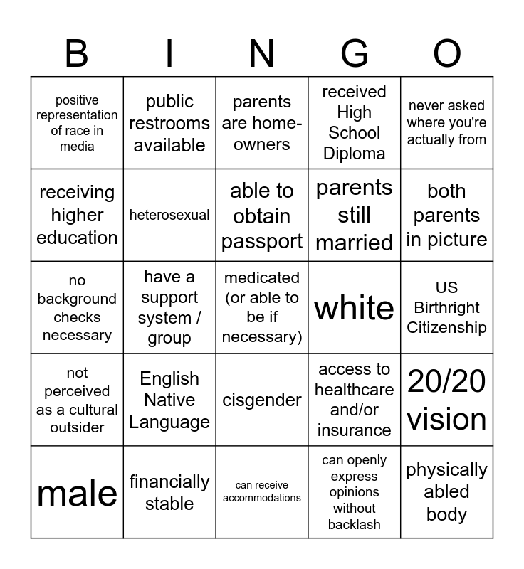 This bingo card has 27 words: access to healthcare and/or insurance, physically abled body, parents still married, can receive accommodations, receiving higher education, parents are home-owners, public restrooms available, not perceived as a cultural outsider, white, 20/20 vision, no background checks necessary, received High School Diploma, male, financially stable, both parents in picture, never asked your real name, heterosexual, able to obtain passport, English Native Language, positive representation of race in media, US Birthright Citizenship, can openly express opinions without backlash, have a support system / group, medicated (or able to be if necessary), cisgender, never asked where you're actually from and never asked if your hair was real.