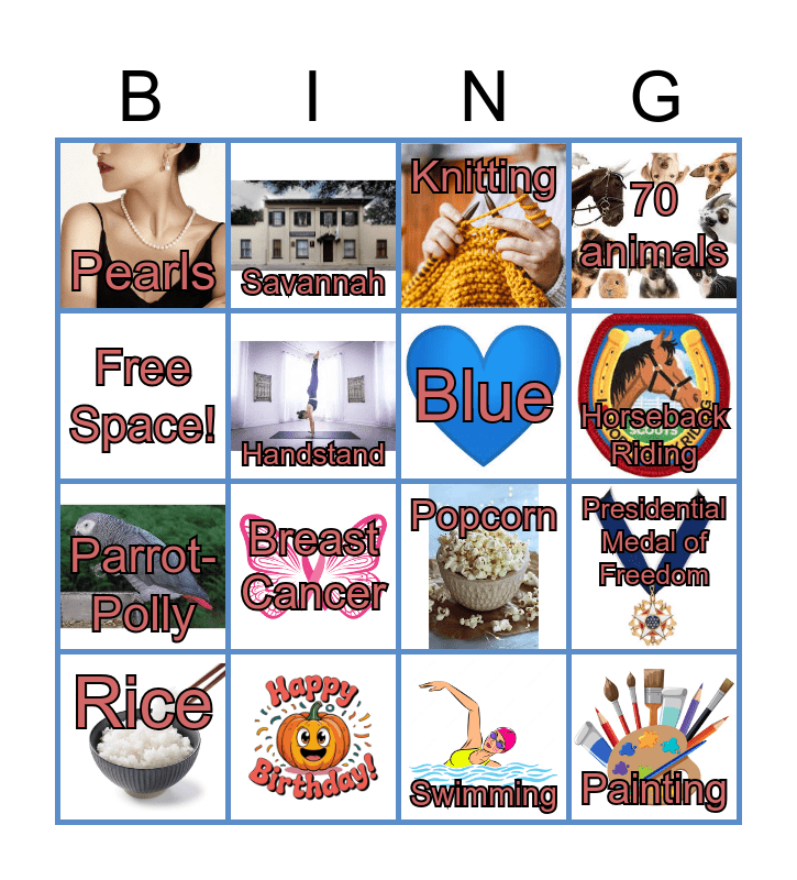 This bingo card has 15 images and 15 words: Presidential Medal of Freedom, Knitting, Pearls, Parrot- Polly, Savannah, Popcorn, Swimming, Free Space!, Handstand, Rice, 70 animals, Breast Cancer, Horseback Riding, Blue and Painting.