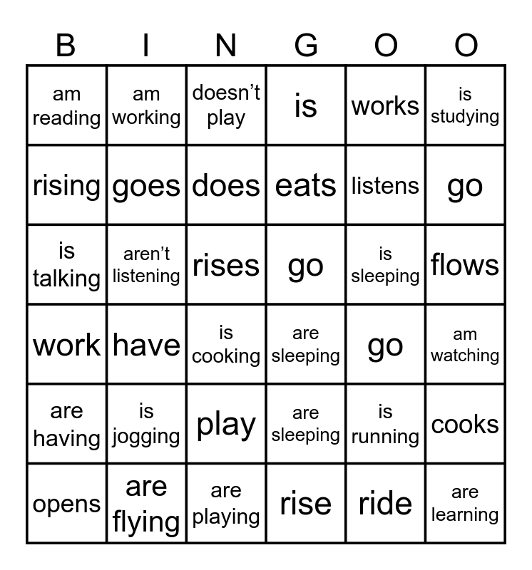 This bingo card has 36 words: are sleeping, play, rise, rising, work, go, goes, are playing, works, is running, go, is, cooks, aren’t listening, eats, am reading, are having, is sleeping, is talking, doesn’t play, rises, have, are sleeping, is cooking, go, am working, listens, are flying, does, is studying, are learning, opens, am watching, flows, is jogging and ride.