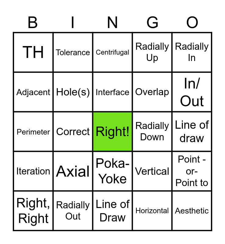 This bingo card has 1 images, a free space and 44 words: Moldflow, Aesthetic, Chunky Soils, Right, Right, Radial, Horizontal, Centrifugal, Stack up, Radially In, Radially Out, Radially Up, Radially Down, Poka-Yoke, Axial, Parallel, Line of Draw, Martian, Perimeter, Up/Down, In/ Out, Tolerance, Mating part, Draft, TH, GCD, Line of draw, Spherical, Angle, Vertical, Iteration, Share, Point -or- Point to, Curvature, Tune, Correct, Team, Left/Right, Execution, Interface, Adjacent, Overlap, Gap, Hole(s) and Gate.