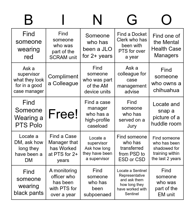 This bingo card has 25 words: Find a Case Manager that has Worked at PTS for 2+ years, Find someone who has been subpoenaed, Find someone who was part of the AM device units, Find someone wearing black pants, Find one of the Mental Health Case Managers, Find someone wearing red, Ask a supervisor what they look for in a good case manager, Find someone who was part of the SCRAM unit, Find someone who has served on a Jury, Locate a supervisor Ask how long they have been a supervisor, Ask a colleague for case management advise, Find Someone Wearing a PTS Polo, Find someone who has transferred from PSD to ESD or CSD, Find someone who has been shadowed for training within the last 2 years, Compliment a Colleague, Find someone who was part of the EM unit, Locate and snap a picture of a huddle room, Someone who has been a JLO for 2+ years, Find someone who owns a chihuahua, Free!, Find a case manager who has a high-profile caseload, A monitoring officer who has been with PTS for over a year, Locate a DM, ask how long they have been a DM, Find a Docket Clerk who has been with PTS for over a year and Locate a Sentinel Representative and ask them how long they have worked with Sentinel.