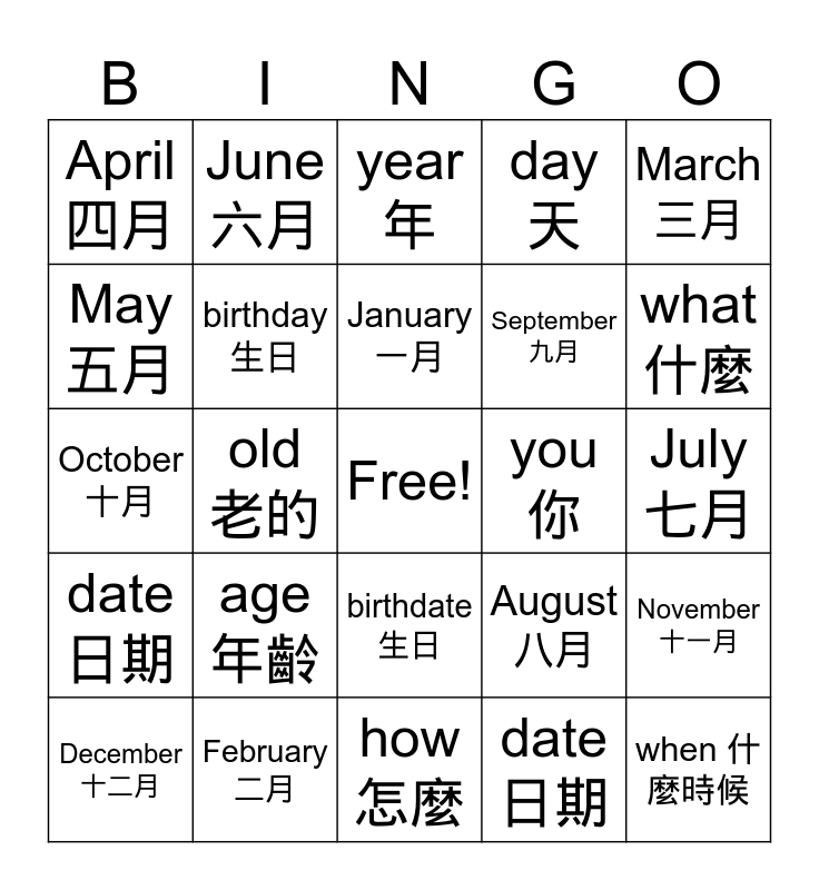 This bingo card has a free space and 26 words: birthdate 生日, date 日期, January 一月, February 二月, March 三月, April 四月, May 五月, June 六月, July 七月, August 八月, September 九月, October 十月, November 十一月, December 十二月, old 老的, born 出生, day 天, date 日期, year 年, when 什麼時候, what 什麼, how 怎麼, you 你, age 年齡, birthday 生日 and month 月份.