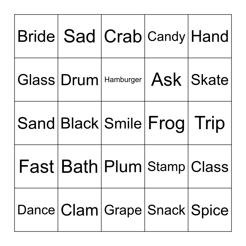 This bingo card has 30 words: Clam, Glue, Black, Sled, Bride, Crab, Drum, Plum, Frog, Grape, Trip, Smile, Snack, Spice, Skate, Camp, Stamp, Fast, Bath, Hand, Sand, Dad, Sad, Ask, Glass, Candy, Class, Dance, Hamburger and Family.