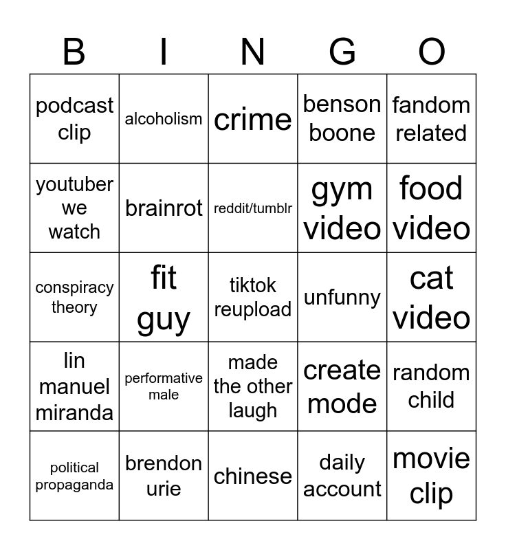 This bingo card has 25 words: performative male, chinese, reddit/tumblr, political propaganda, fandom related, podcast clip, youtuber we watch, alcoholism, unfunny, made the other laugh, gym video, conspiracy theory, create mode, random child, brainrot, movie clip, cat video, crime, food video, fit guy, tiktok reupload, brendon urie, lin manuel miranda, benson boone and daily account.