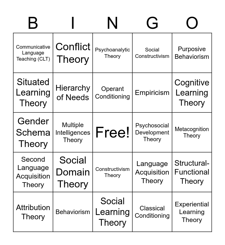 This bingo card has a free space and 27 words: Attribution Theory, Behaviorism, Operant Conditioning, Classical Conditioning, Cognitive Learning Theory, Communicative Language Teaching (CLT), Conflict Theory, Constructivism Theory, Empiricism, Experiential Learning Theory, Gender Schema Theory, Hierarchy of Needs, Humanistic Learning Theory, Language Acquisition Theory, Metacognition Theory, Moral Development Theory, Multiple Intelligences Theory, Psychoanalytic Theory, Psychosocial Development Theory, Purposive Behaviorism, Second Language Acquisition Theory, Social Domain Theory, Social Learning Theory, Social Constructivism, Structural-Functional Theory, Situated Learning Theory and Transformative Learning Theory.