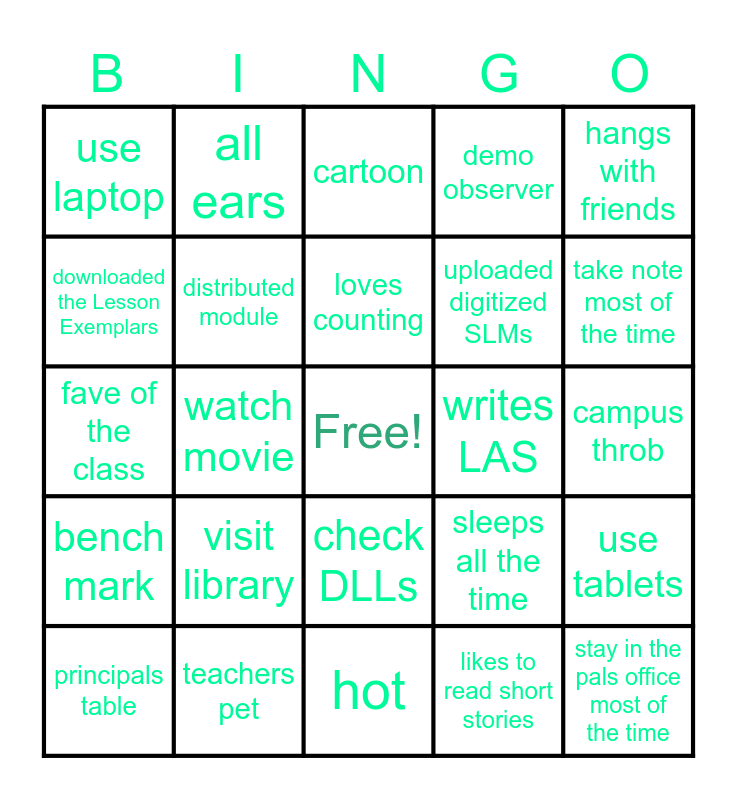 This bingo card has a free space and 24 words: visit library, teachers pet, loves counting, principals table, hangs with friends, use laptop, downloaded the Lesson Exemplars, all ears, writes LAS, check DLLs, uploaded digitized SLMs, fave of the class, sleeps all the time, use tablets, distributed module, likes to read short stories, campus throb, cartoon, take note most of the time, watch movie, stay in the pals office most of the time, bench mark, demo observer and hot.