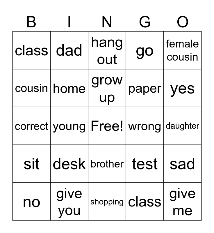 This bingo card has a free space and 64 words: hello, fine, good, sad, happy, mom, dad, family, grow up, sister, brother, son, daughter, female cousin, male cousin, cousin, young, class, school, paper, desk, sit, go, ask, teacher, student, learn, teach, who, what, where, when, why, how, yes, no, help, class, smart, home, correct, wrong, work, book, study, give me, give you, pen, test, want, enjoy, music, shopping, sports, movie, eat, hang out, listen, parents, step mother, old, together, people and play.