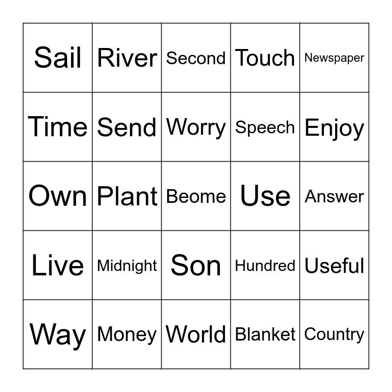 This bingo card has 30 words: Money, Plan, Plant, Poster, Sail, Second, Send, Son, Use, World, Answer, Beome, Blanket, Country, Enjoy, Finger, Hundred, Live, Midnight, Newspaper, Own, Picnic, River, Speech, Time, Touch, Useful, Way, Worry and Year.