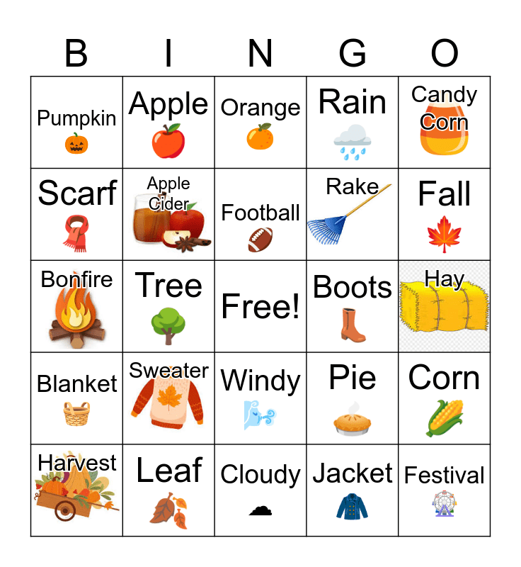 This bingo card has 7 images, a free space and 24 words: Sweater, Leaf ๐, Football ๐, Harvest, Candy Corn, Pumpkin ๐, Scarf ๐งฃ, Apple ๐, Boots ๐ข, Windy ๐ฌ๏ธ, Rake, Bonfire, Pie ๐ฅง, Corn ๐ฝ, Apple Cider, Jacket ๐งฅ, Hay, Orange ๐, Fall ๐, Tree ๐ณ, Festival ๐ก, Blanket ๐งบ, Rain ๐ง and Cloudy โ.
