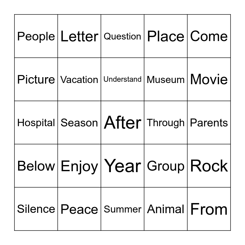 This bingo card has 30 words: Peace, On, Season, War, People, Question, Vacation, Year, Through, Summer, Parents, After, Animal, From, Movie, Often, Group, Below, Enjoy, Come, Hospital, Hurry, Letter, Museum, Picture, Place, Rock, Silence, Understand and Wonder.